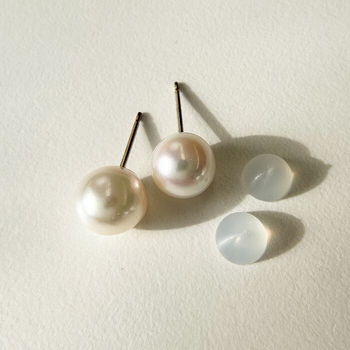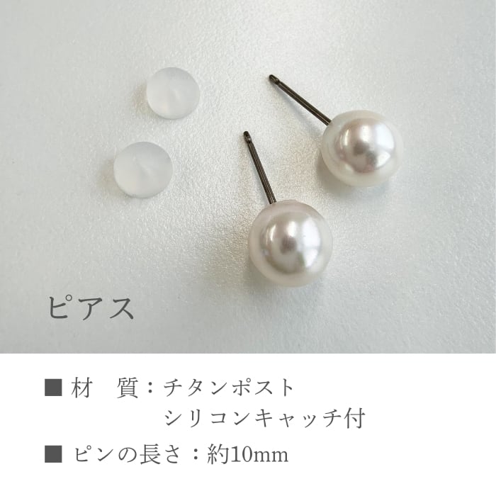 珠は定番使いしやすい7.0-8.0mmサイズで、ポストは金属アレルギーの方も安心なチタン製。シリコンキャッチ付きで外れにくく、装着感も安定しています。